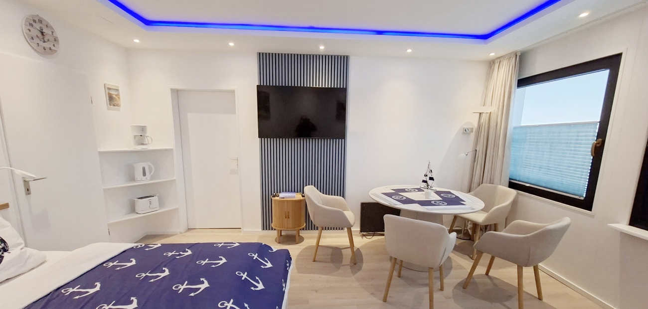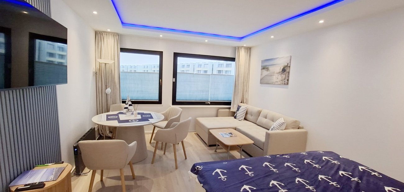 Das helle Wohnzimmer ist der Mittelpunkt der Wohnung und lädt mit einer komfortablen Schlafcouch, einem Doppelbett sowie einem Esstisch für vier Personen zum Verweilen ein. Ein moderner 50-Zoll-Smart-TV sorgt für Unterhaltung, während der Blick aus dem Fenster direkt auf den Yachthafen mit seinem maritimen Flair und einem Hauch Meerblick fällt.